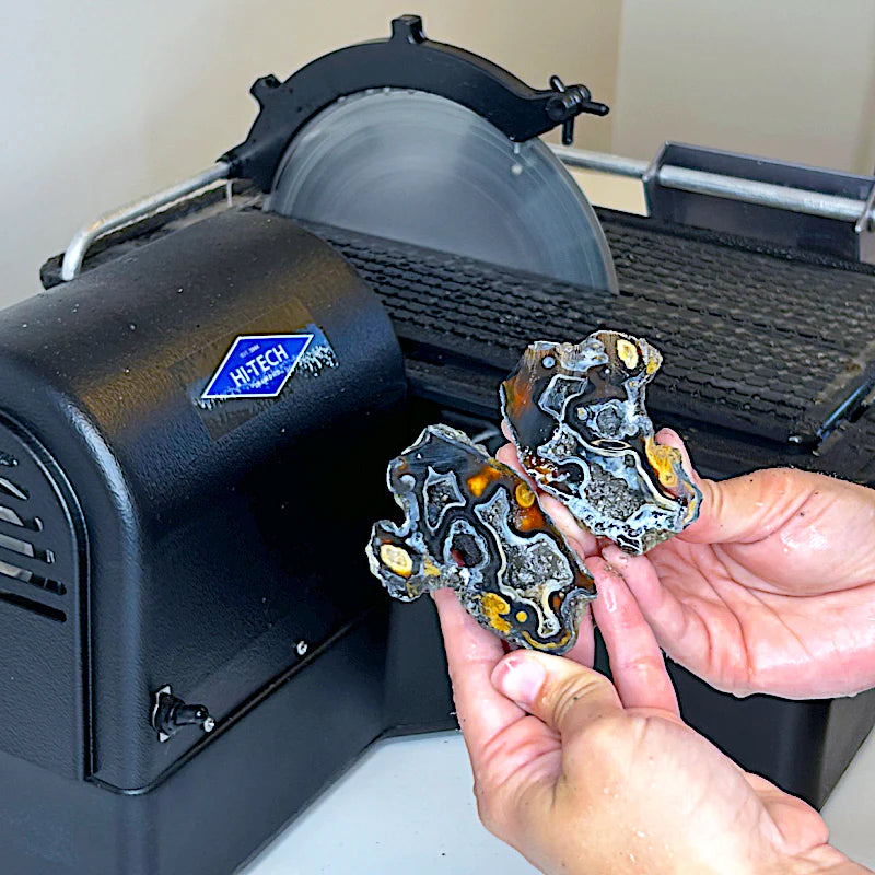 This Hi-Tech Diamond 10" slab saw machine comes with twp different types of 10" saw blades to best-suit your cutting material. The notched diamond saw blade is designed for slabbing large rocks and minerals such as agates, jades and geodes, while the sintered diamond saw blade is designed for cutting large pieces of glass, topaz, quartz and fine agates.