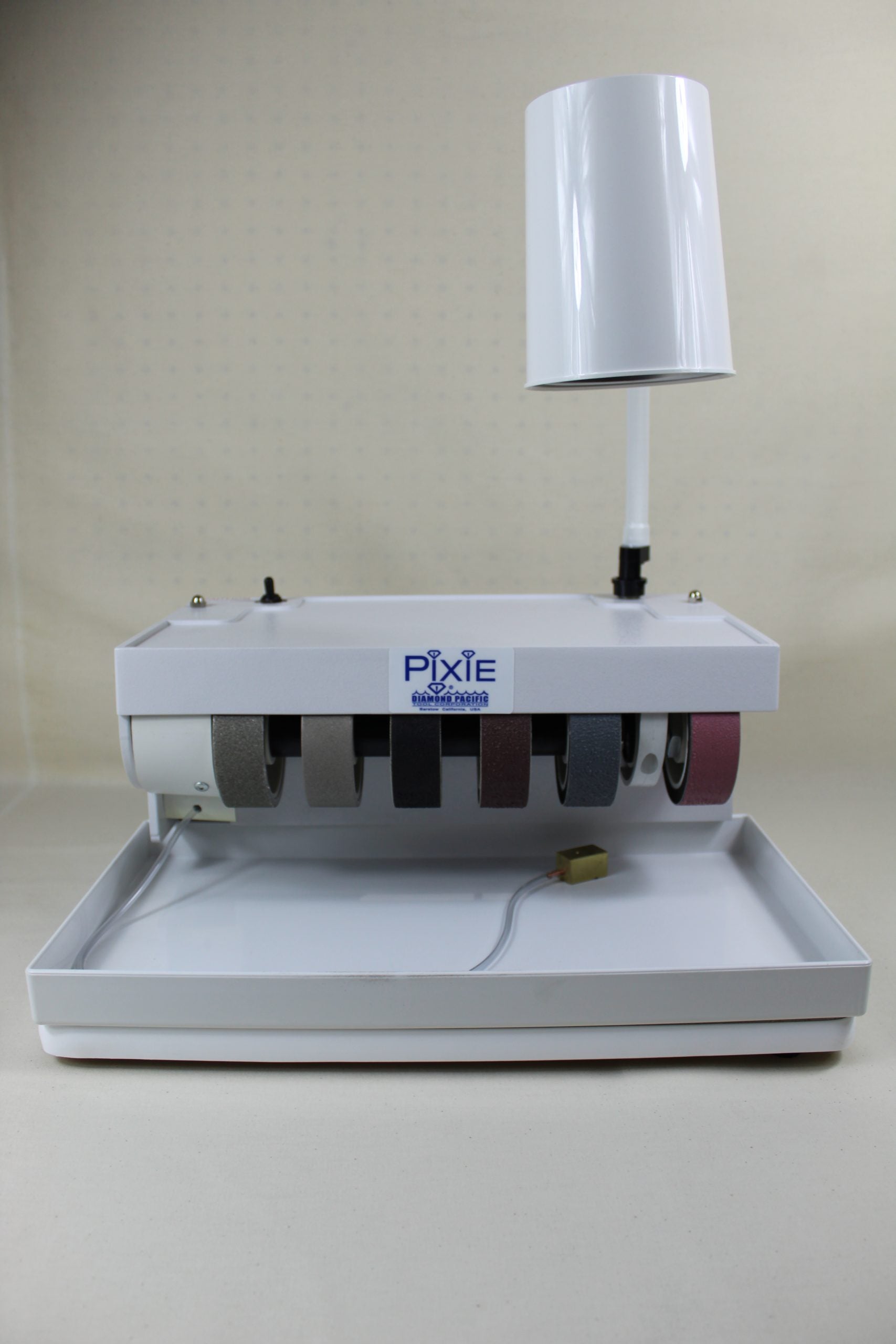 The Pixie is compact and lightweight. The Pixie features a durable, molded housing that makes the machine the most lightweight, compact and efficient 4″ wheel, grinding and polishing machine available. It weighs less than 30 lbs. including the lamp, and fits on a Formica baseboard that measures only 141⁄2″ x 18″. It requires no special hook-ups or plumbing, so it can easily be used in your RV or wherever space is limited and a standard 115V outlet is available.